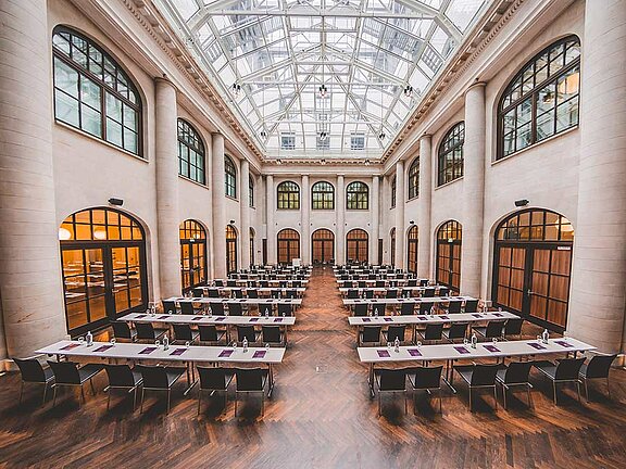 Entdecken Sie das Atrium Package – das pulsierende Herzstück des Humboldt Carré, wo Geschichte auf Innovation trifft. Tauchen Sie ein in die faszinierende Atmosphäre unseres Atriums / historischen Kassenhalle, deren imposantes Glasdach, 12 Meter hohe Sandsteinsäulen und elegantes Parkett jeden Moment zum Erlebnis machen. Dieses einzigartige Ambiente schafft den perfekten Rahmen für unvergessliche Events – von inspirierenden Tagungen über bis hin zu glanzvollen Gala-Dinners.