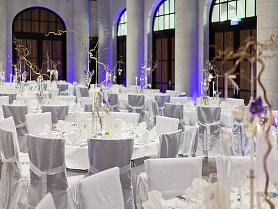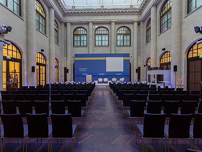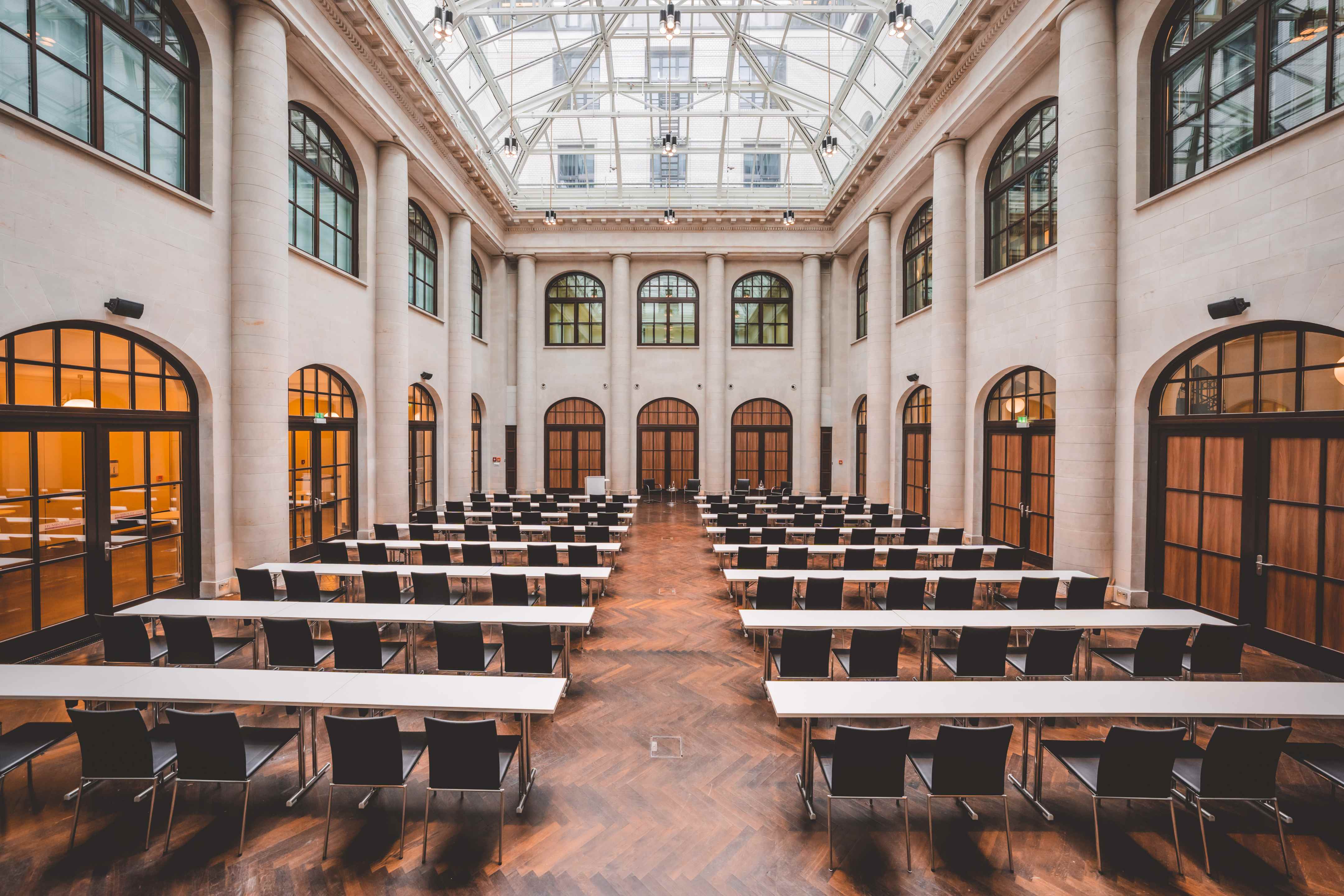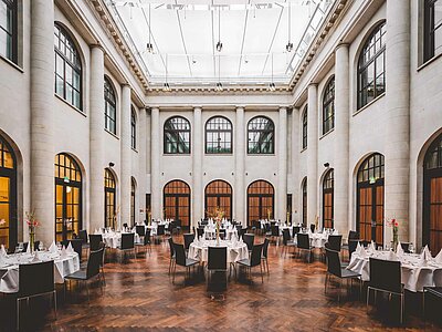Entdecken Sie das Herzstück des Humboldt Carrés: das atemberaubende Atrium / Historische Kassenhalle – Ihr maßgeschneiderter Raum für unvergessliche Events!