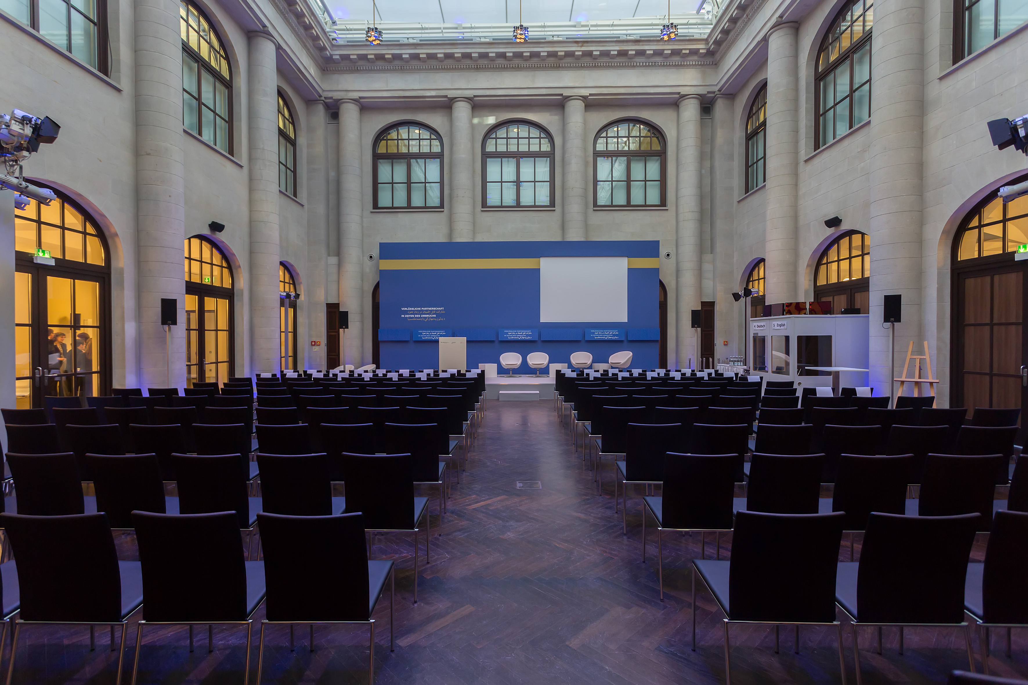 Die 10 Meter lange Humboldt Bühne mit modernster Veranstaltungstechnik schafft die ideale Plattform für Ihre Keynotes, Podiumsdiskussionen oder Konzerte