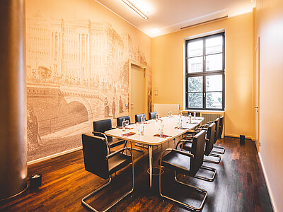Der Breakout-Raum Goethe – Ihr Ort für kleine Meetings, kreative Breakouts und inspirierende Workshops. Mit unserer digitalen Raumbeschilderung ist der Tagesablauf immer klar sichtbar, optional ergänzt durch einen großen Flatscreen und eine interaktive digitale Flipchart für Ideensprünge. Viel Tageslicht, frische Luft und eine individuell steuerbare Verdunkelung sorgen für das perfekte Arbeitsambiente – ideal für konzentrierte Brainstorms, präzise Abstimmungen und exklusive Verhandlungen. Und auf Wunsch kommt der Pause-Spaß kommt nicht zu kurz: Tischkicker für den Kick zwischen den Sessions.